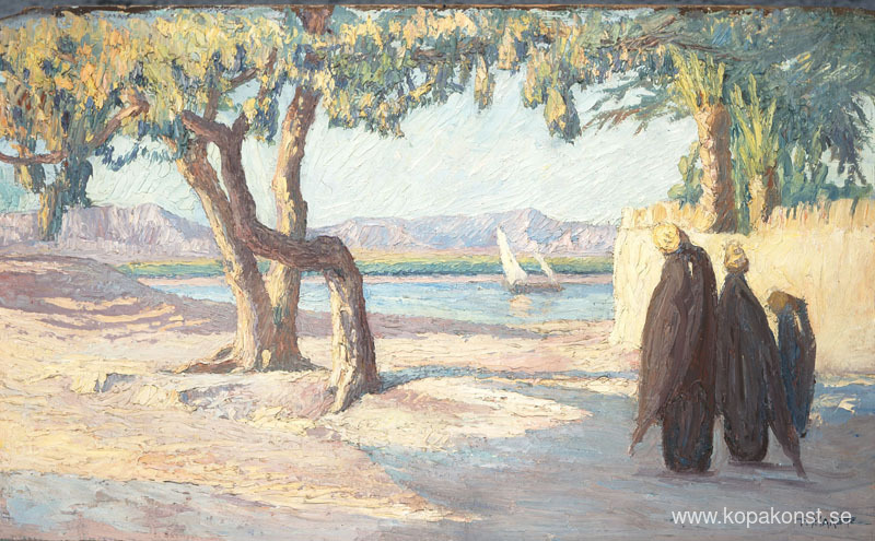 Vi erbjuder dig en hantverksmässig reproduktion på duk av det berömda konstverket 'Nilens landskap' av Constantine Maleas, från Reproduktionsmuseet.