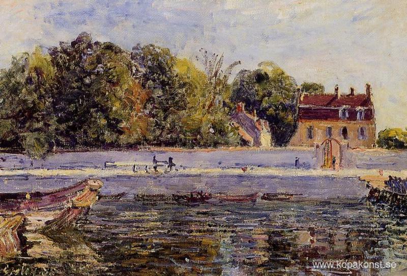 Vi erbjuder dig en hantverksmässig reproduktion på duk av det berömda konstverket 'Saint Mammes hus på Canal du Loing' av Alfred Sisley, från Reproduktionsmuseet.