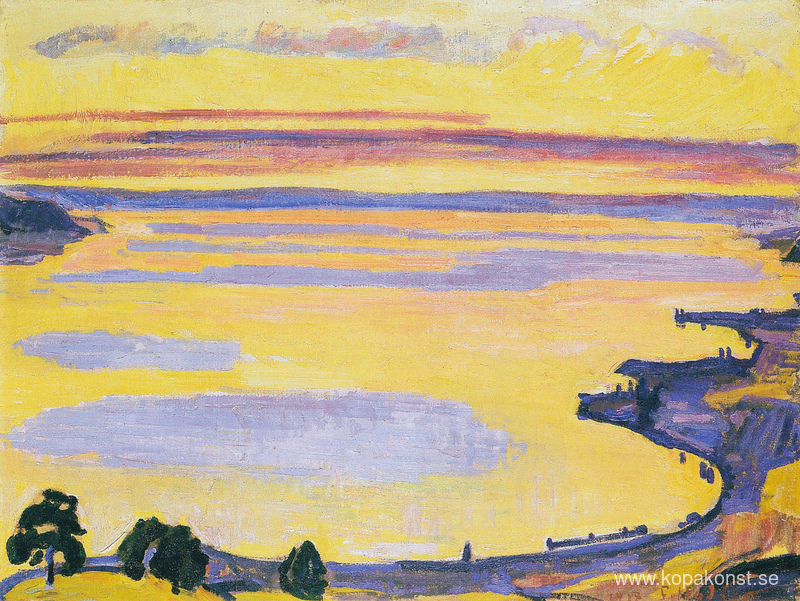 Vi erbjuder dig en hantverksmässig reproduktion på duk av det berömda konstverket 'Solnedgång på Genèvesjön från Caux' av Ferdinand Hodler, från Reproduktionsmuseet.