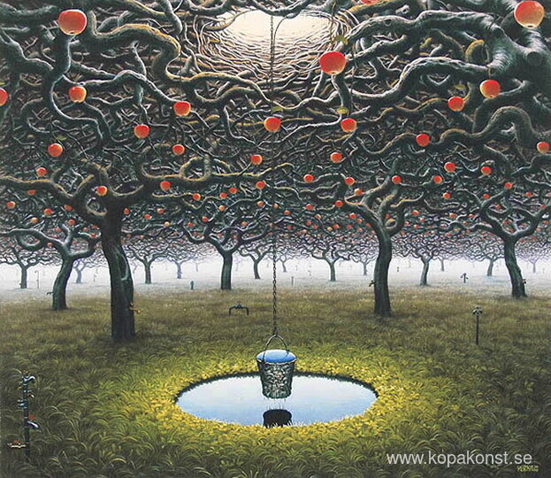 Vi erbjuder dig en hantverksmässig reproduktion på duk av det berömda konstverket 'Trädgård' av Jacek Yerka, från Reproduktionsmuseet.