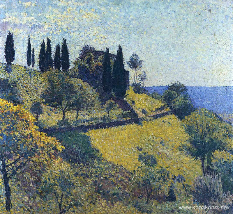 Vi erbjuder dig en hantverksmässig reproduktion på duk av det berömda konstverket 'Utsikt från konstnärens studio' av Henri Martin, från Reproduktionsmuseet.