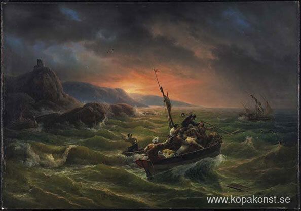 Vi erbjuder dig en hantverksmässig reproduktion på duk av det berömda konstverket 'Pirater som slåss vid soluppgången' av Horace Vernet, från Reproduktionsmuseet.