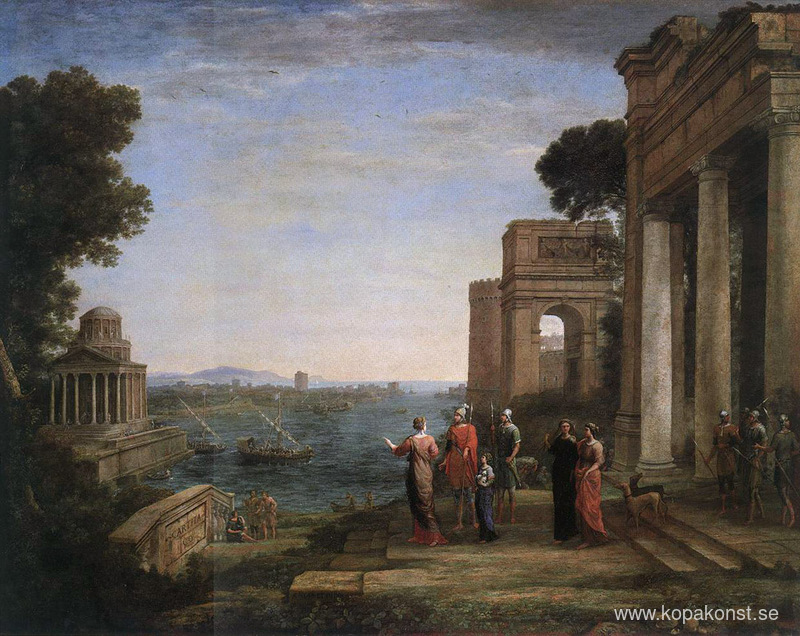 Vi erbjuder dig en hantverksmässig reproduktion på duk av det berömda konstverket 'Aeneas och Dido i Kartago' av Claude Lorrain, från Reproduktionsmuseet.