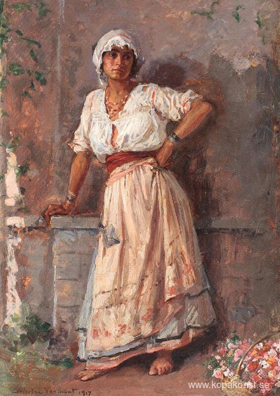 Vi erbjuder dig en hantverksmässig reproduktion på duk av det berömda konstverket 'Blomsterflicka' av Nicolae Vermont, från Reproduktionsmuseet.