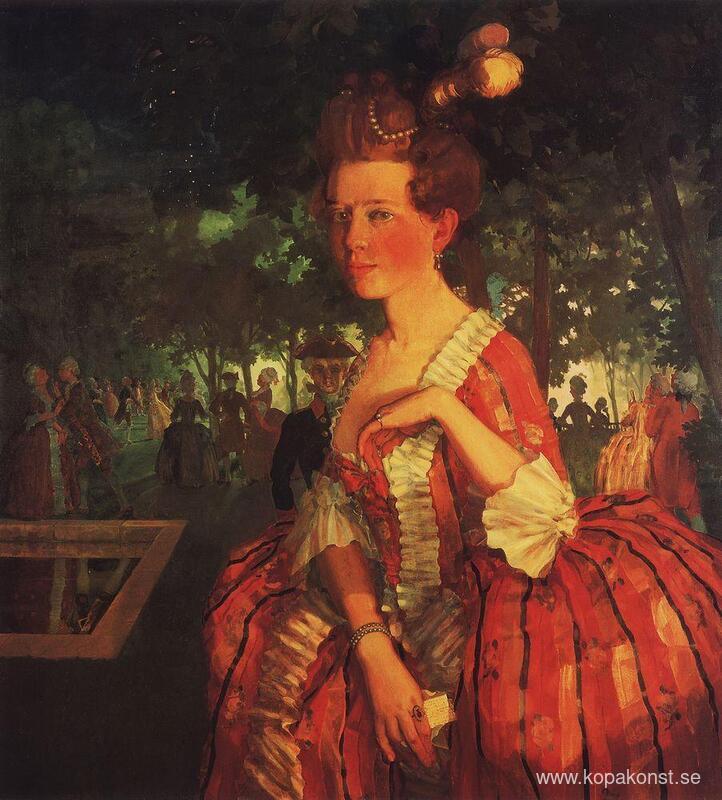 Vi erbjuder dig en hantverksmässig reproduktion på duk av det berömda konstverket 'En ung flicka i en röd klänning (flicka med ett brev)' av Konstantin Somov, från Reproduktionsmuseet.