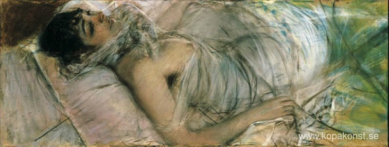 Vi erbjuder dig en hantverksmässig reproduktion på duk av det berömda konstverket 'Grevinnan de Rasty ljuger' av Giovanni Boldini, från Reproduktionsmuseet.