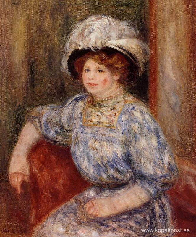 Vi erbjuder dig en hantverksmässig reproduktion på duk av det berömda konstverket 'Kvinna i blått' av Pierre-Auguste Renoir, från Reproduktionsmuseet.