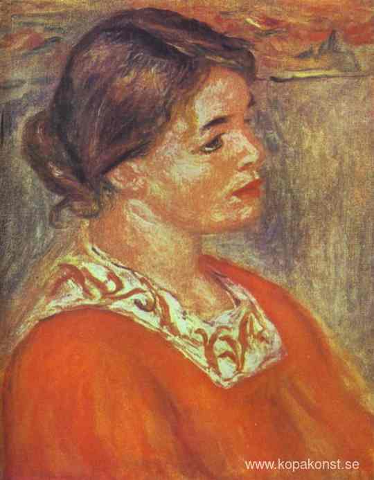 Vi erbjuder dig en hantverksmässig reproduktion på duk av det berömda konstverket 'Kvinna i en röd blus' av Pierre-Auguste Renoir, från Reproduktionsmuseet.