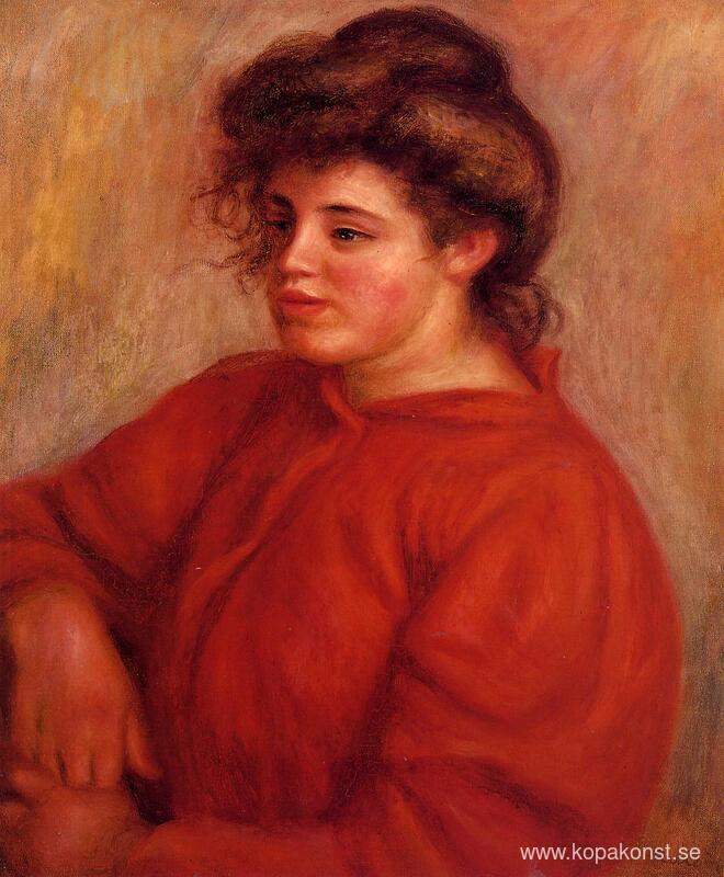 Vi erbjuder dig en hantverksmässig reproduktion på duk av det berömda konstverket 'Kvinna i en röd blus' av Pierre-Auguste Renoir, från Reproduktionsmuseet.