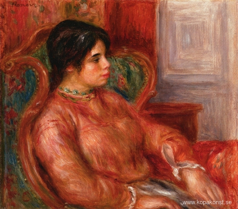 Vi erbjuder dig en hantverksmässig reproduktion på duk av det berömda konstverket 'Kvinna med grön stol' av Pierre-Auguste Renoir, från Reproduktionsmuseet.