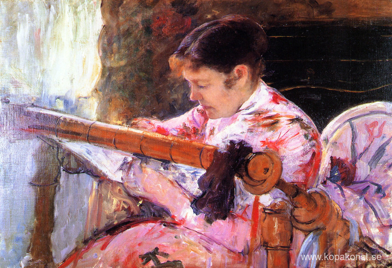 Vi erbjuder dig en hantverksmässig reproduktion på duk av det berömda konstverket 'Lydia vid Gobelängvävstolen' av Mary Cassatt, från Reproduktionsmuseet.
