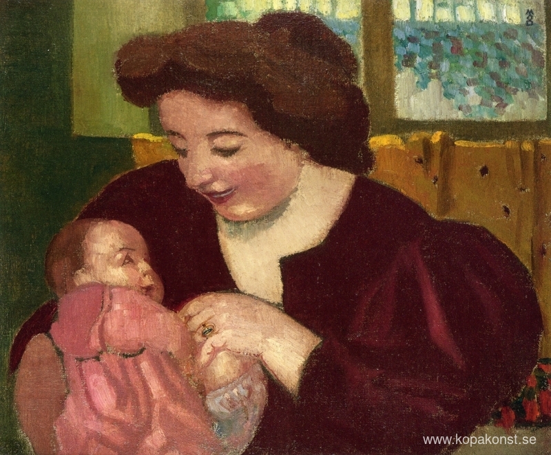 Vi erbjuder dig en hantverksmässig reproduktion på duk av det berömda konstverket 'Maternite, Anne Marie och Marthe a la Bague Ovale' av Maurice Denis, från Reproduktionsmuseet.