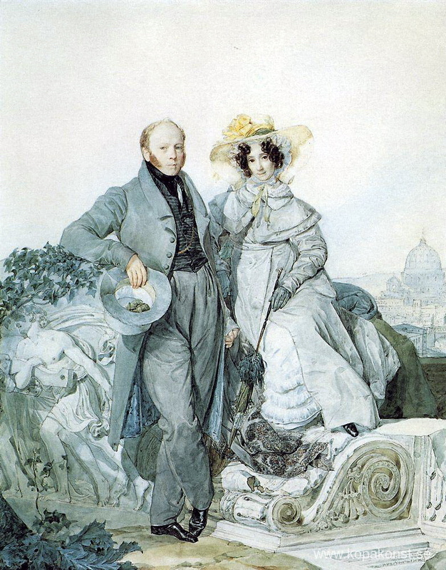 Vi erbjuder dig en hantverksmässig reproduktion på duk av det berömda konstverket 'Porträtt av G. N. och V. A. Olenin' av Karl Bryullov, från Reproduktionsmuseet.
