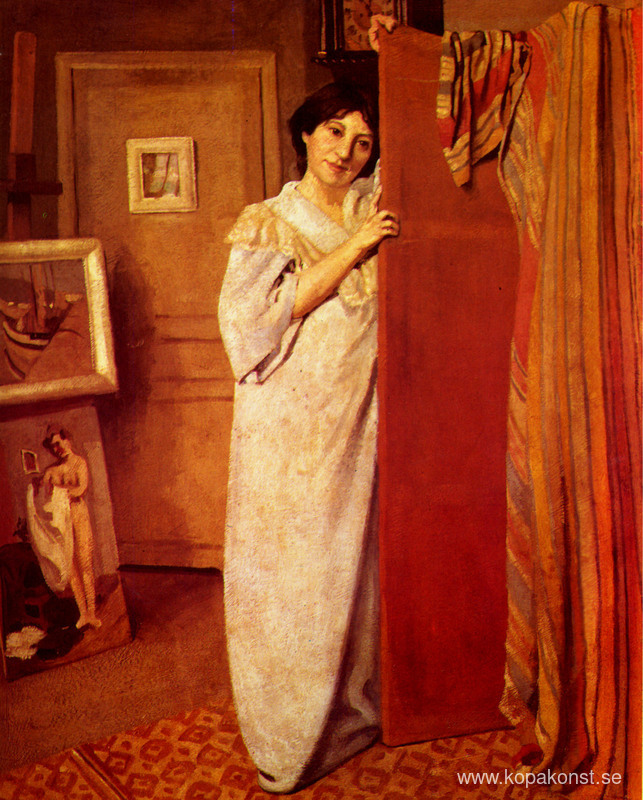 Vi erbjuder dig en hantverksmässig reproduktion på duk av det berömda konstverket 'Porträtt av verkstad med figur (min fru)' av Felix Vallotton , från Reproduktionsmuseet.