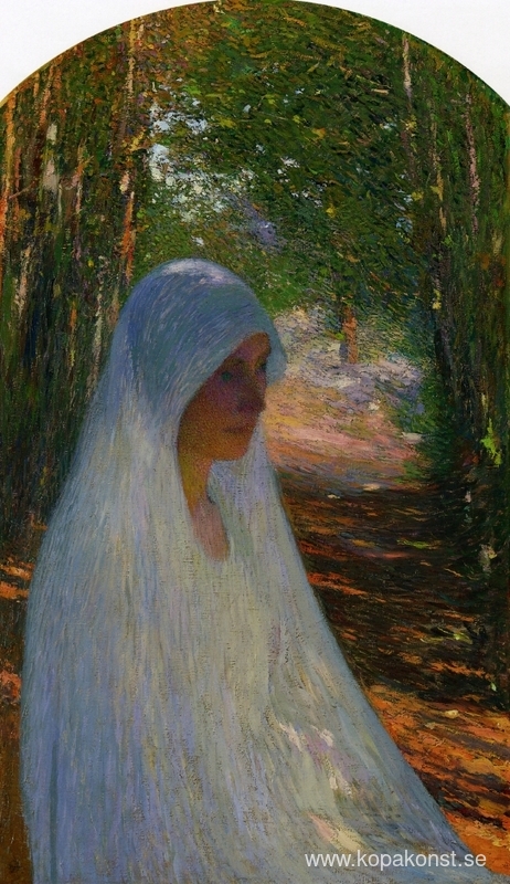 Vi erbjuder dig en hantverksmässig reproduktion på duk av det berömda konstverket 'Ung kvinna beslöjad i vitt i en skog' av Henri Martin, från Reproduktionsmuseet.