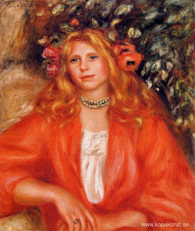 Vi erbjuder dig en hantverksmässig reproduktion på duk av det berömda konstverket 'Ung kvinna som bär en krans av blommor' av Pierre-Auguste Renoir, från Reproduktionsmuseet.