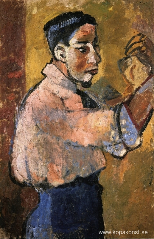 Vi erbjuder dig en hantverksmässig reproduktion på duk av det berömda konstverket 'Ung man med ett bockskägg' av Natalia Goncharova, från Reproduktionsmuseet.