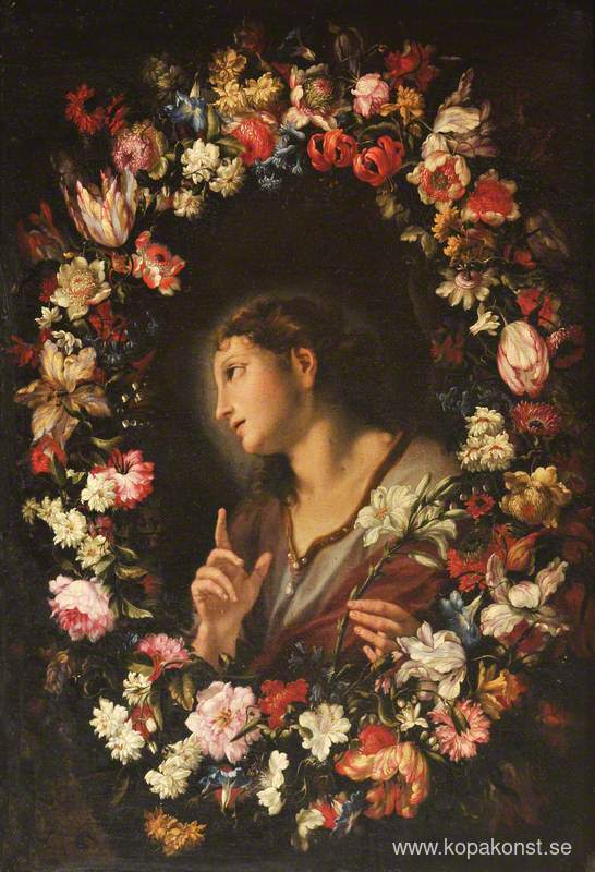Vi erbjuder dig en hantverksmässig reproduktion på duk av det berömda konstverket 'Bebådelsens ängel i en krans av blommor' av Mario Nuzzi, från Reproduktionsmuseet.