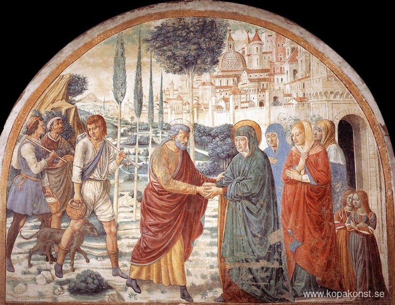 Vi erbjuder dig en hantverksmässig reproduktion på duk av det berömda konstverket 'Besökets tabernakel: Möte vid Gyllene porten' av Benozzo Gozzoli, från Reproduktionsmuseet.