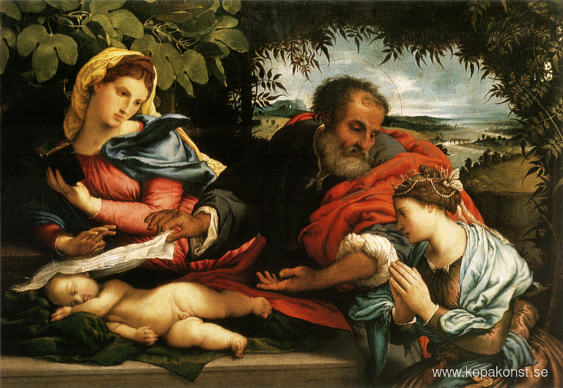 Vi erbjuder dig en hantverksmässig reproduktion på duk av det berömda konstverket 'Den heliga familjen med den heliga Katarina av Alexandria' av Lorenzo Lotto, från Reproduktionsmuseet.