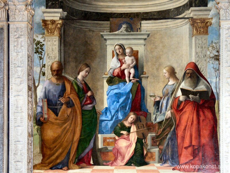 Vi erbjuder dig en hantverksmässig reproduktion på duk av det berömda konstverket 'Heligt samtal' av Giovanni Bellini, från Reproduktionsmuseet.