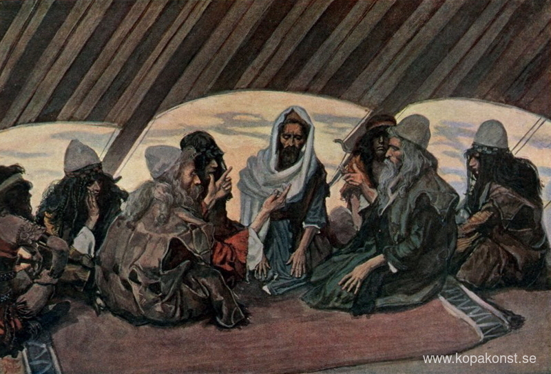 Vi erbjuder dig en hantverksmässig reproduktion på duk av det berömda konstverket 'Jetro och Moses, som i 2 Mosebok 18' av James Tissot, från Reproduktionsmuseet.