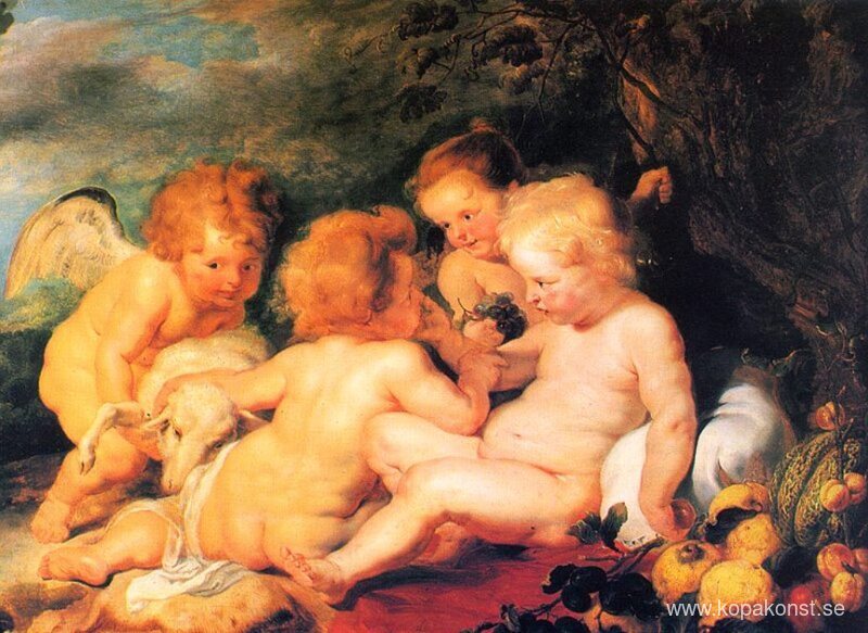 Vi erbjuder dig en hantverksmässig reproduktion på duk av det berömda konstverket 'Kristus och Johannes med änglar' av Peter Paul Rubens, från Reproduktionsmuseet.