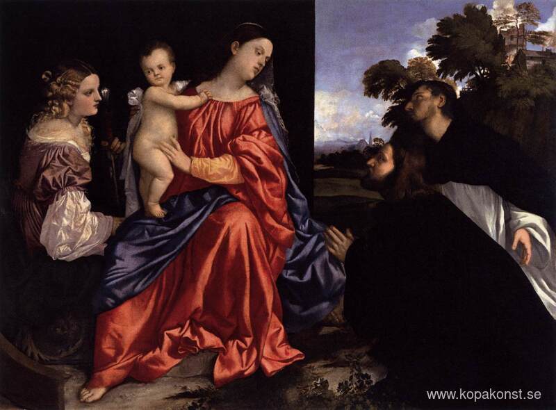 Vi erbjuder dig en hantverksmässig reproduktion på duk av det berömda konstverket 'Madonna och barn med Sts Catherine och Dominic och en donator' av Titian, från Reproduktionsmuseet.