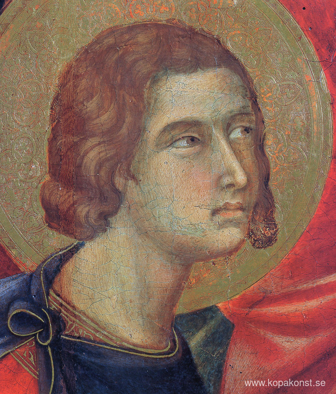 Vi erbjuder dig en hantverksmässig reproduktion på duk av det berömda konstverket 'Madonna och barn på en tron ​​(Fragment på framsidan)' av Duccio, från Reproduktionsmuseet.