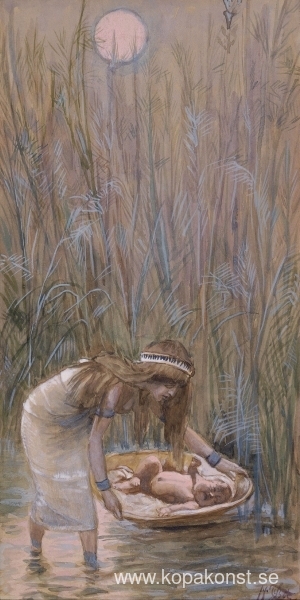 Vi erbjuder dig en hantverksmässig reproduktion på duk av det berömda konstverket 'Moses lades bland flaggorna' av James Tissot, från Reproduktionsmuseet.