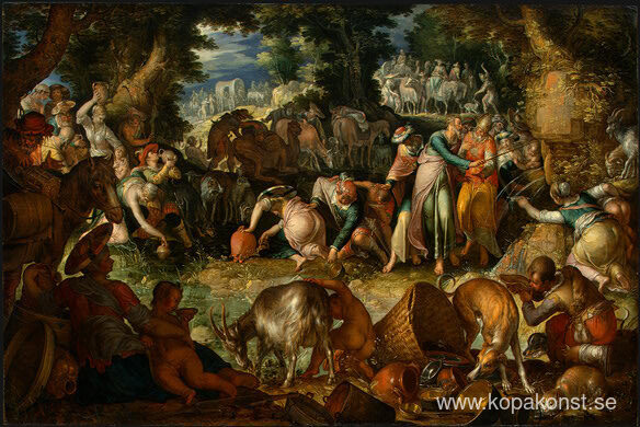 Vi erbjuder dig en hantverksmässig reproduktion på duk av det berömda konstverket 'Moses slår klippan' av Joachim Wtewael, från Reproduktionsmuseet.