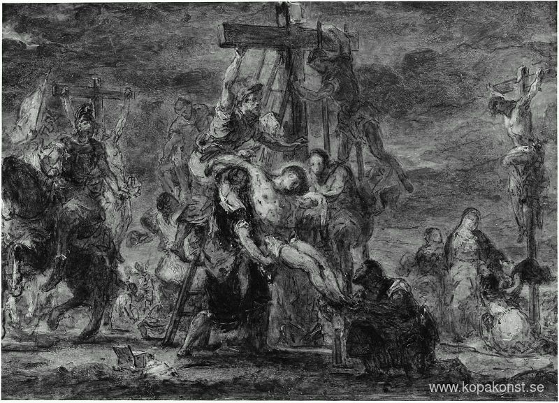 Vi erbjuder dig en hantverksmässig reproduktion på duk av det berömda konstverket 'Nedstigningen från korset' av Eugene Delacroix, från Reproduktionsmuseet.