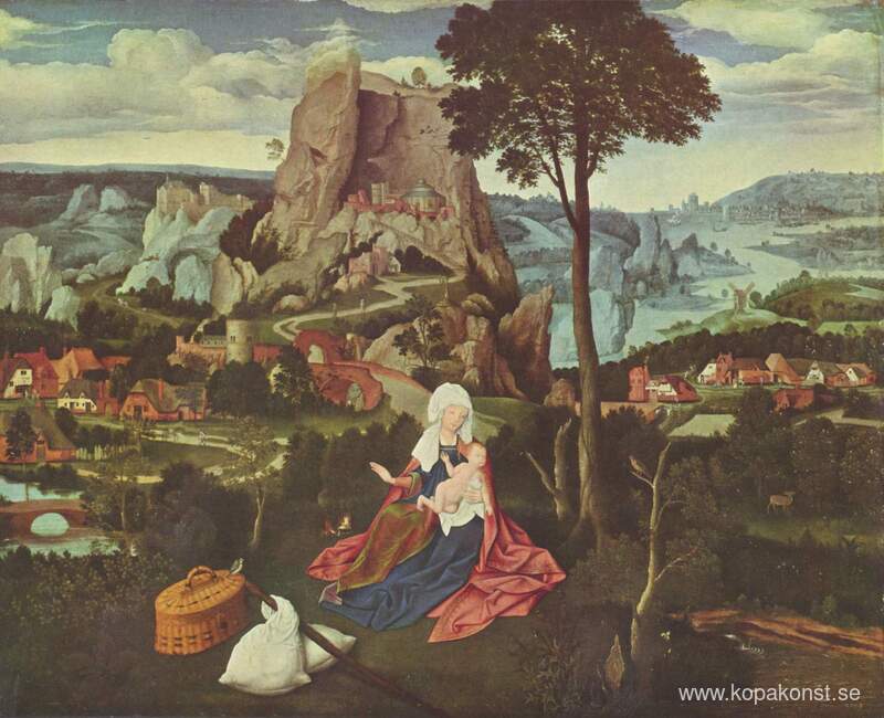 Vi erbjuder dig en hantverksmässig reproduktion på duk av det berömda konstverket 'Resten av flykten till Egypten' av Joachim Patinir, från Reproduktionsmuseet.
