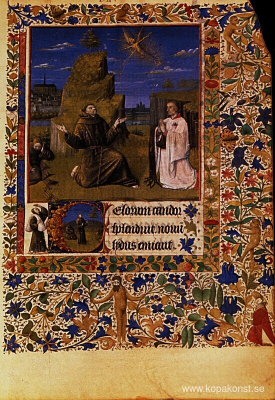 Vi erbjuder dig en hantverksmässig reproduktion på duk av det berömda konstverket 'St Francis tar emot Stigmata' av Jean Fouquet, från Reproduktionsmuseet.