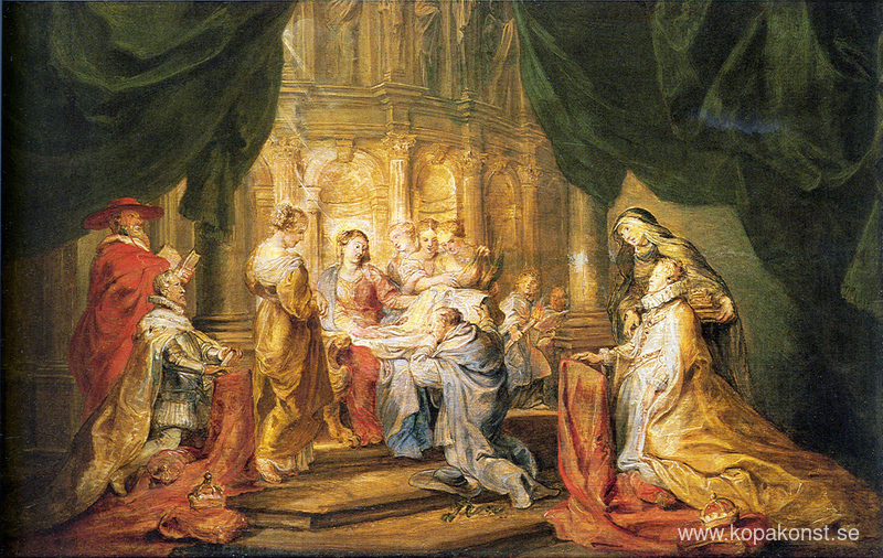 Vi erbjuder dig en hantverksmässig reproduktion på duk av det berömda konstverket 'St Ildefonso tar emot en prästkappa' av Peter Paul Rubens, från Reproduktionsmuseet.