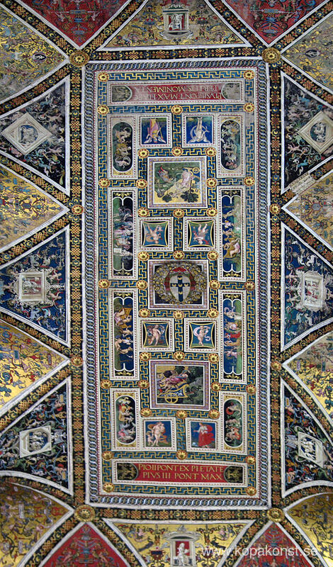 Vi erbjuder dig en hantverksmässig reproduktion på duk av det berömda konstverket 'Taket i Piccolomini-biblioteket i Sienas katedral' av Pinturicchio, från Reproduktionsmuseet.