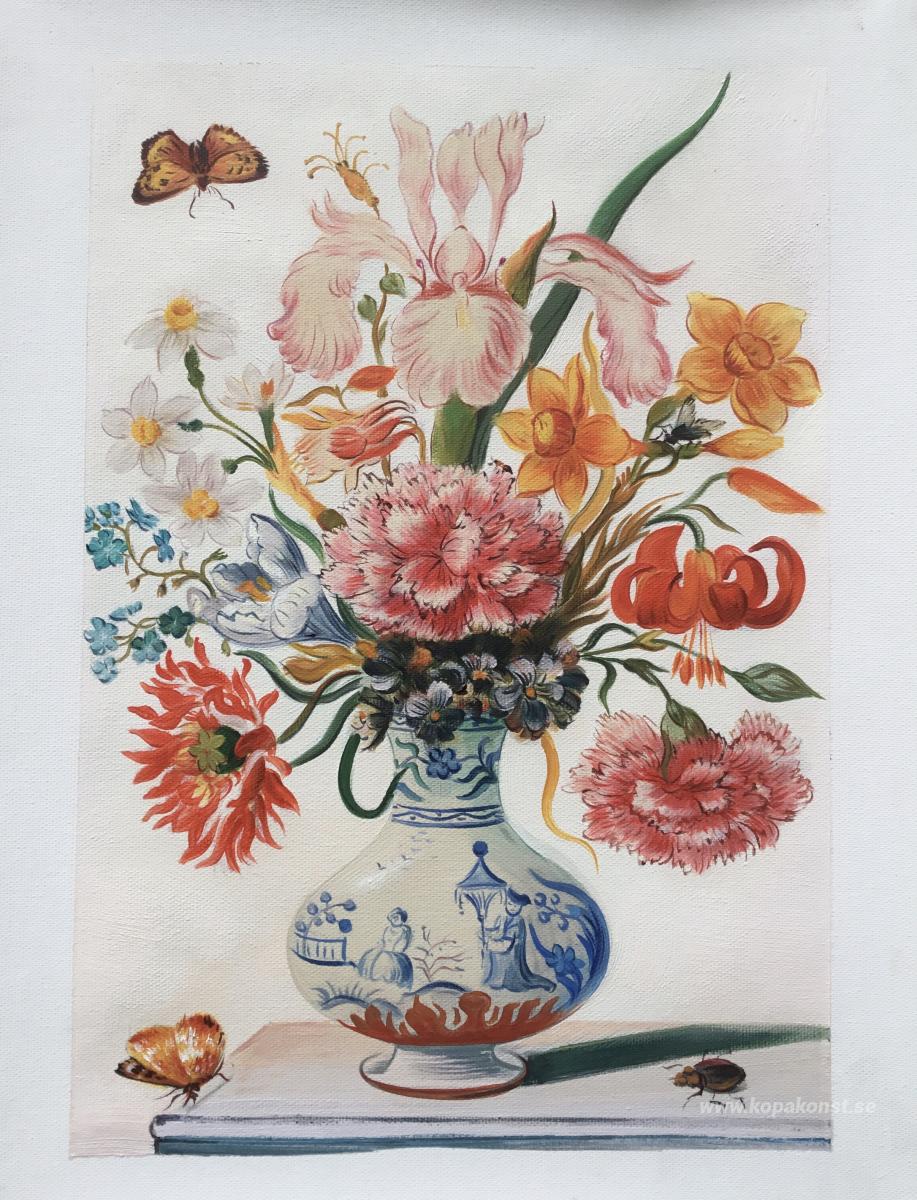 Vas med vallmo, blåklint, pioner och krysantemum