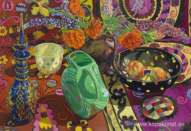 Vi erbjuder dig en hantverksmässig reproduktion på duk av det berömda konstverket 'Blå karaff, prickig skål, Suzani' av Janet Fish, från Reproduktionsmuseet.
