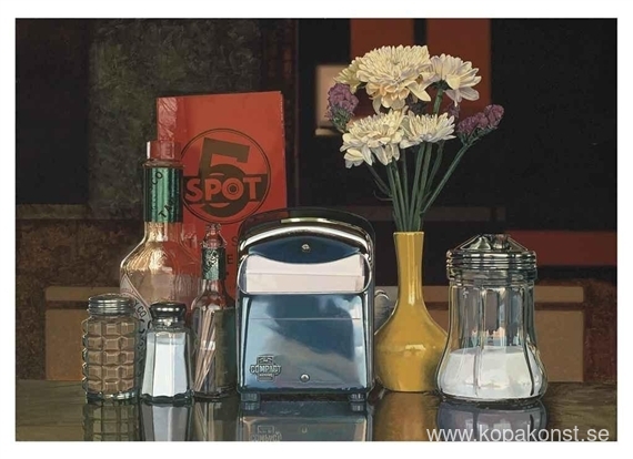 Vi erbjuder dig en hantverksmässig reproduktion på duk av det berömda konstverket 'Femfläcksstilleben' av Ralph Goings, från Reproduktionsmuseet.