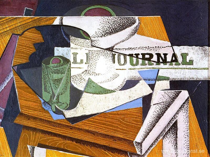 Vi erbjuder dig en hantverksmässig reproduktion på duk av det berömda konstverket 'Fruktskål, bok och tidning' av Juan Gris, från Reproduktionsmuseet.