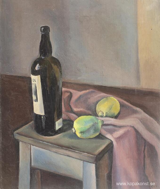 Vi erbjuder dig en hantverksmässig reproduktion på duk av det berömda konstverket 'Stilleben med vinflaska och citroner' av Henri Catargi, från Reproduktionsmuseet.