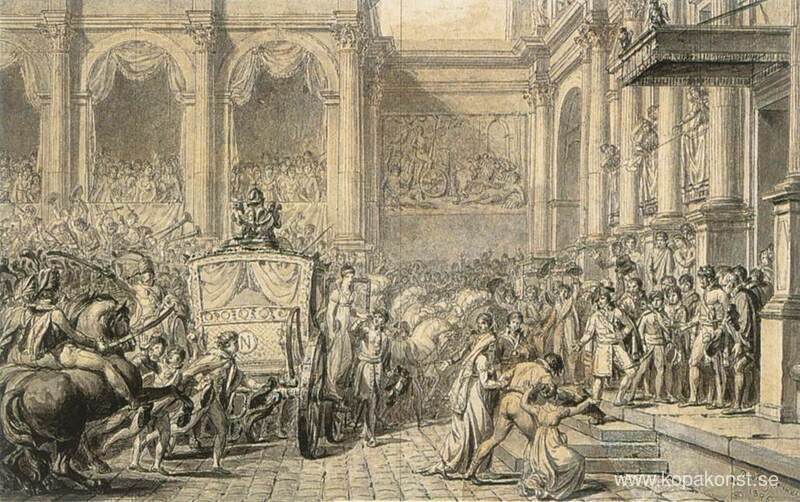 Vi erbjuder dig en hantverksmässig reproduktion på duk av det berömda konstverket 'Ankomsten till Hôtel de Ville' av Jacques-Louis David, från Reproduktionsmuseet.