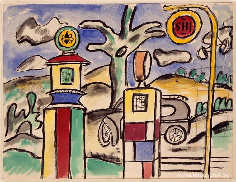 Vi erbjuder dig en hantverksmässig reproduktion på duk av det berömda konstverket 'Bensinstationen (studie för staden)' av Fernand Leger, från Reproduktionsmuseet.