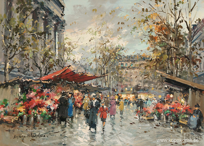 Vi erbjuder dig en hantverksmässig reproduktion på duk av det berömda konstverket 'Blomstermarknad Madeleine' av Antoine Blanchard, från Reproduktionsmuseet.
