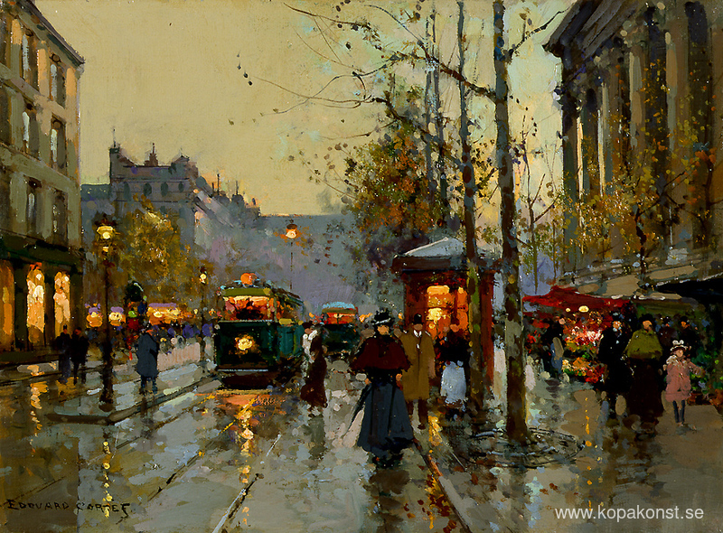 Vi erbjuder dig en hantverksmässig reproduktion på duk av det berömda konstverket 'Blomstermarknad på La Madeleine' av Edouard Cortes, från Reproduktionsmuseet.