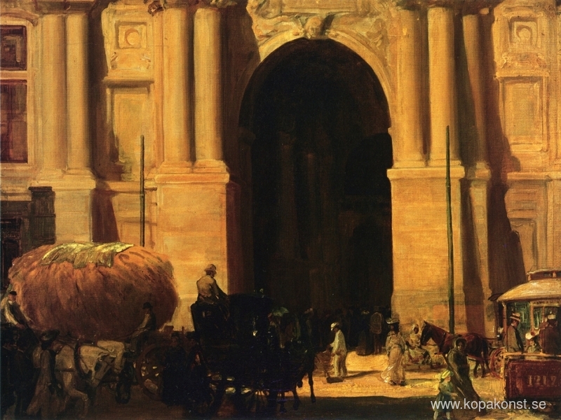 Vi erbjuder dig en hantverksmässig reproduktion på duk av det berömda konstverket 'East Entrance, Stadshuset, Philadelphia' av John French Sloan, från Reproduktionsmuseet.