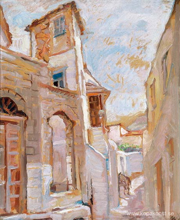Vi erbjuder dig en hantverksmässig reproduktion på duk av det berömda konstverket 'Joniska gränden' av Periklis Vyzantios , från Reproduktionsmuseet.