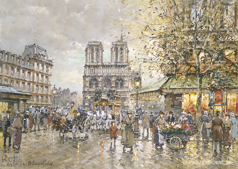Vi erbjuder dig en hantverksmässig reproduktion på duk av det berömda konstverket 'Place Saint Michel, Notre Dame' av Antoine Blanchard, från Reproduktionsmuseet.