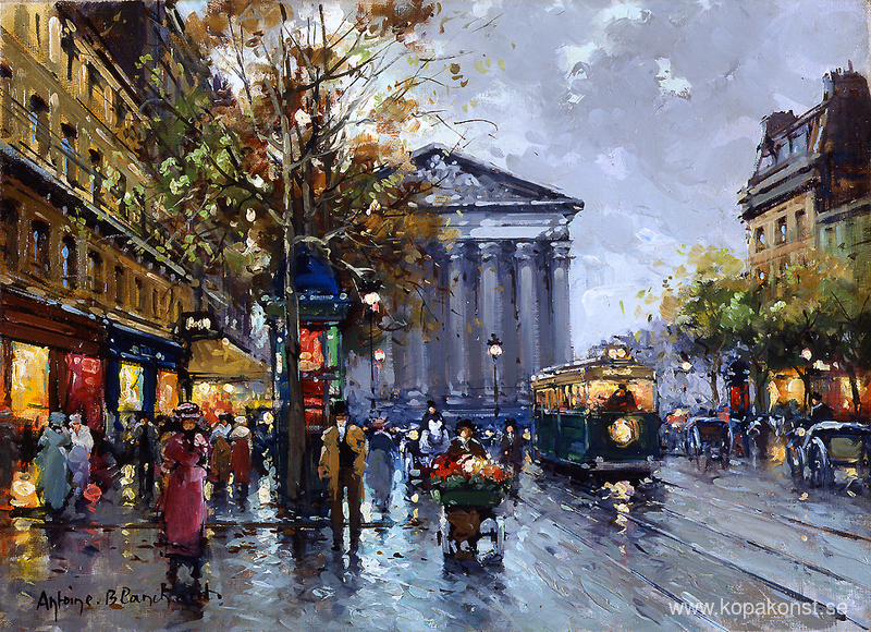 Vi erbjuder dig en hantverksmässig reproduktion på duk av det berömda konstverket 'Rue Royal Madeleine' av Antoine Blanchard, från Reproduktionsmuseet.