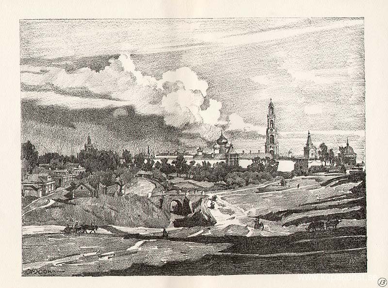 Vi erbjuder dig en hantverksmässig reproduktion på duk av det berömda konstverket 'Sergiyev Posad. Klostrets utsikt från norr' av Konstantin Yuon, från Reproduktionsmuseet.